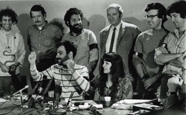 Jerry Rubin at microphone with Nancy Kurshan. Behind them are the Chicago Seven defendants (not including Bobby Seale), from the Chicago conspiracy trial. Abbie Hoffman is on the far left. Photo from AP.