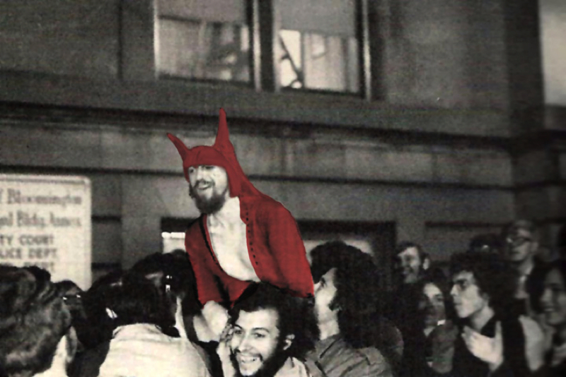 Sensing a potential “cosmic/revolutionary convergence,” Jim planned a Yippie counter-performance. As Kerr began his remarks, Jim, who’d been hiding in the wings, rushed onstage decked out in a red devil costume and threw a cream pie in the speaker’s face. Hoping to get away, the “red devil” was nonetheless caught, arrested, convicted of disorderly conduct, and sentenced to 90 days in jail. The “pieing” of Clark Kerr made national and international news and spawned a new “movement” in political pastry slinging.